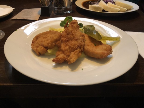 The chicken schnitzel and mash was really good and only 140 Kč.
