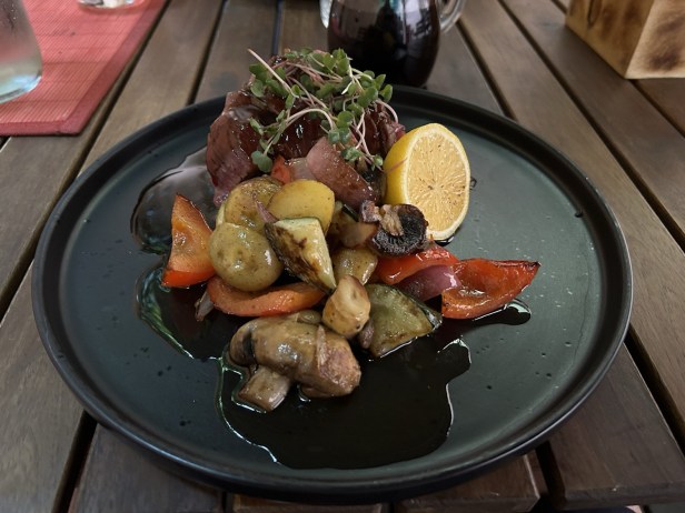 Our food arrived. The vegetables were fresh and perfectly cooked. The steak was tender and delicious, but also sliced before cooking.