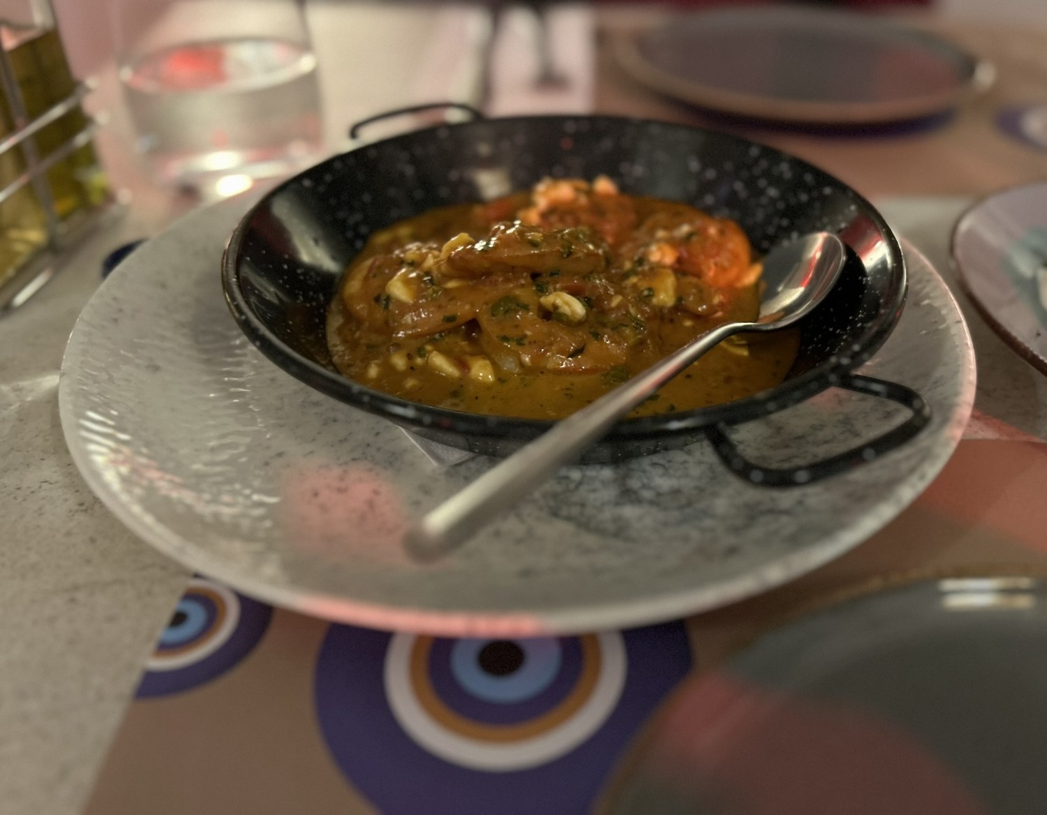 Shrimp saganaki – roasted shrimps, fresh tomato sauce, Feta cheese, basil (395 Kč).