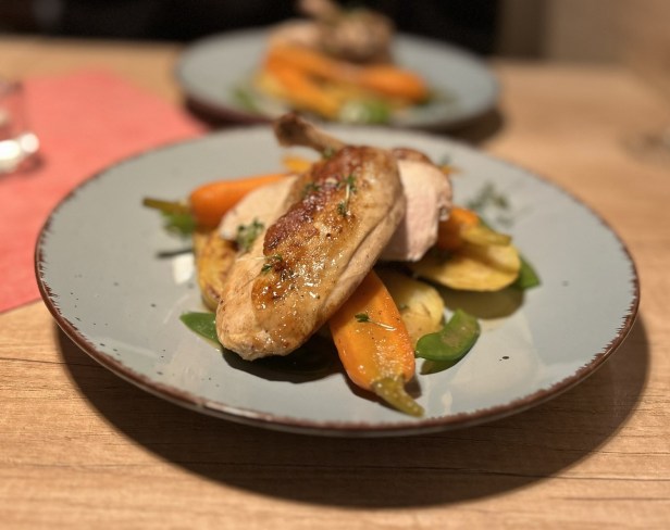 I realise that we should have tried different dishes to review, but we both wanted Roasted Chicken Breast Supreme with carrots roasted in maple syrup, young pea pods, grilled polenta, watercress and thick chicken gravy (270 Kč). We will go back, try something else and update this review.