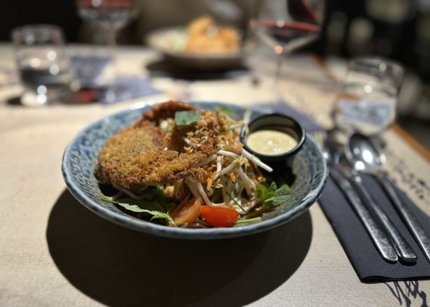 Sadly, the above dish has been replaced by Crispy fried soft shell crab with macadamia nuts, Thai vegetable salad, coconut milk dressing and mango mayonnaise with chili (348 Kč). This new version was really disappointing – the crispy batter (instead of tempura) didn’t work well with the soft shell crab, instead of delicious kimchi, there was a salad, too big for what is really a starter (I also didn’t really like it) and the price is 100 Kč higher.