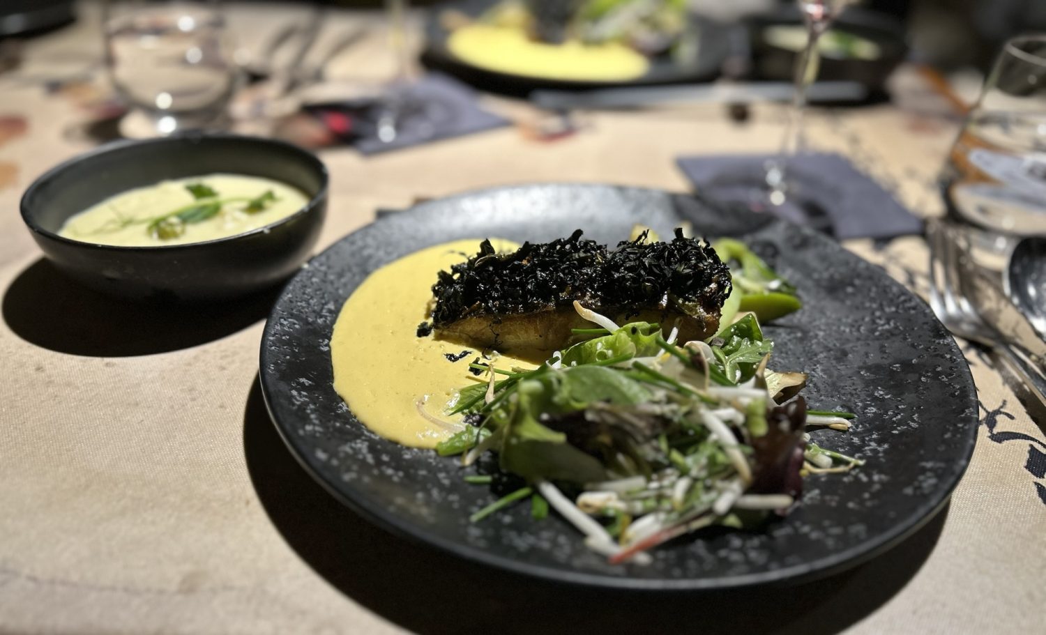 The Sea Bass Furikake – pan-roasted fillet, yuzu hollandaise sauce with miso, green asparagus, king mushrooms and wasabi mashed potatoes (488 Kč) – this was the second time we’d had this and it’s a good dish.