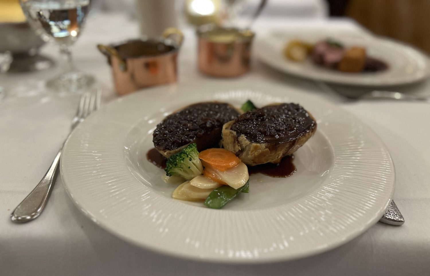 A delicious beef wellington with red wine sauce and glazed vegetables 625 Kč. Also a side of mashed potato in a brass pot 110 Kč.