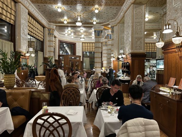 The interior is in the style of a grand café, with high ceilings, impressive pillars and ceramic tile mosaics.