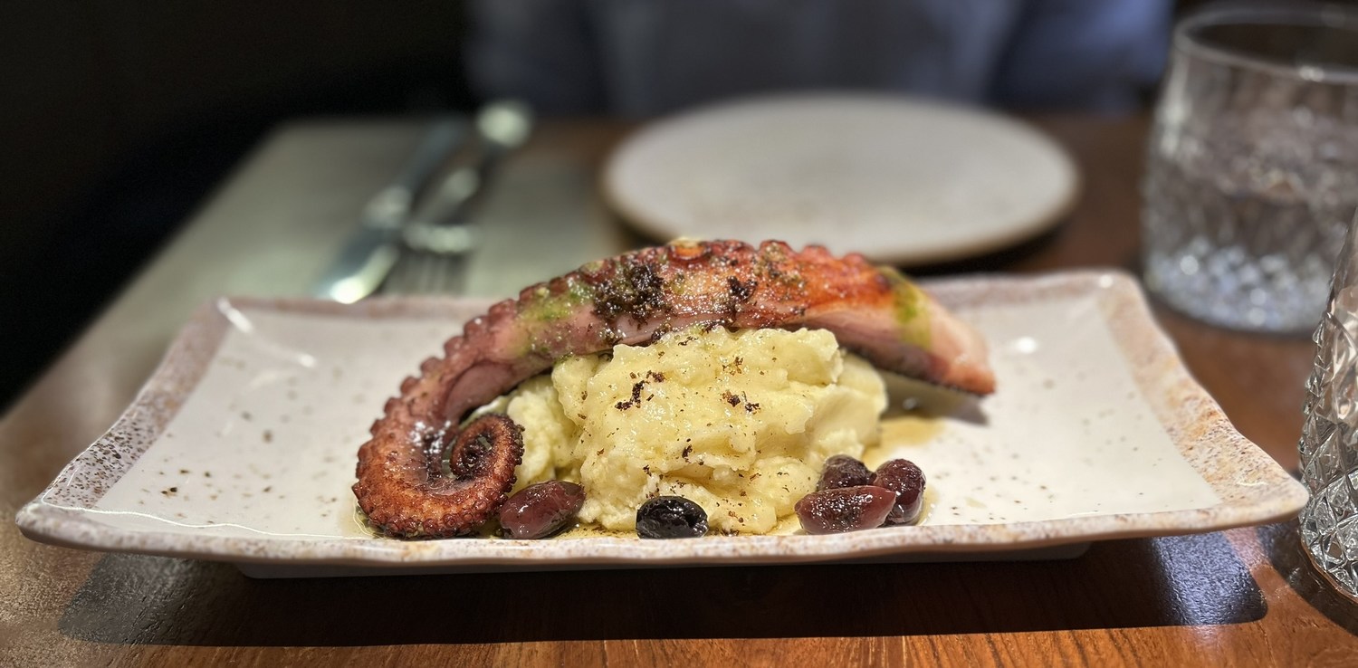 A perfectly cooked and tender Grilled octopus with Genovese Pesto on Mashed Potatoes €17.00.