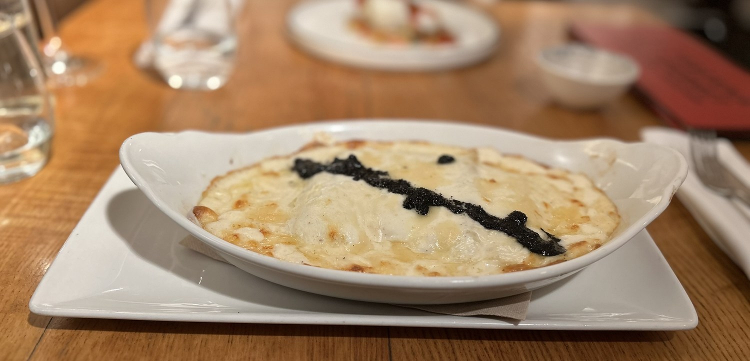 Meat and foie gras cannelloni with béchamel and black truffle €21.70. This was probably the best of all the delicious dishes we enjoyed.