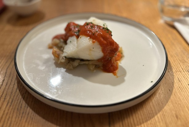 Cod with tomato sauce and roasted vegetables €28.95.