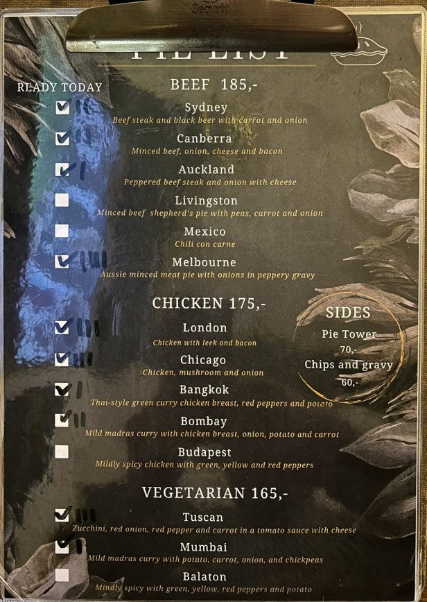 You can also order pies frozen to take away for 135 Kč. Bring your own bag as they didn’t have any and just gave me two frozen pies.