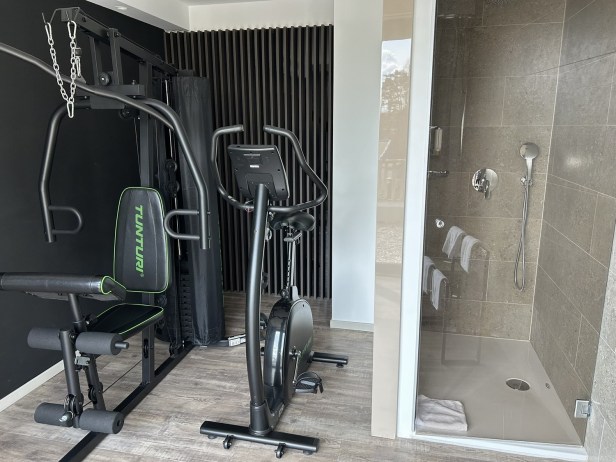 The gym room also includes a shower.