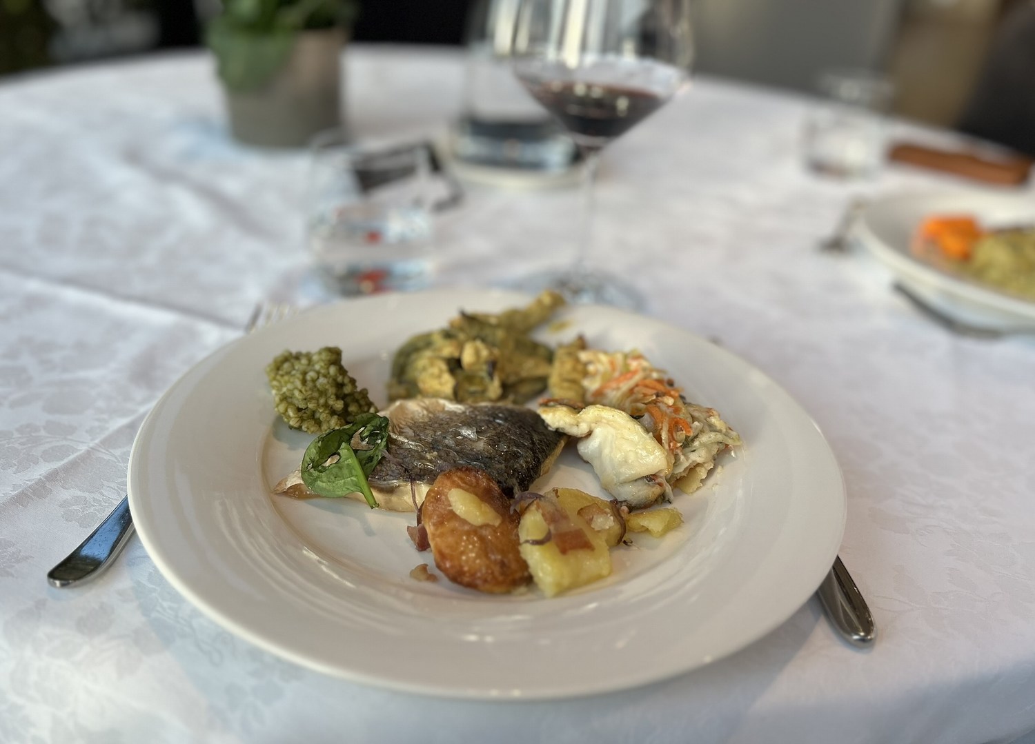We booked half board – there isn’t anywhere else nearby to have dinner. The dinner was a good buffet, with plenty of dishes to choose from. A 0.1l glass of Merlot €4. A carafe of tap water was free.