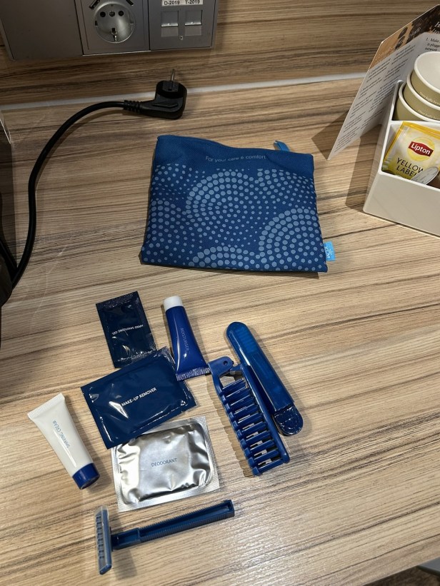 I explained that my checked luggage (held overnight until my flight at 16.00 next day) contained all my toiletries. They gave me a complimentary amenity pack, similar to what you receive on a KLM flight.