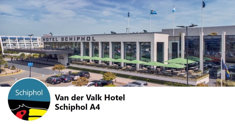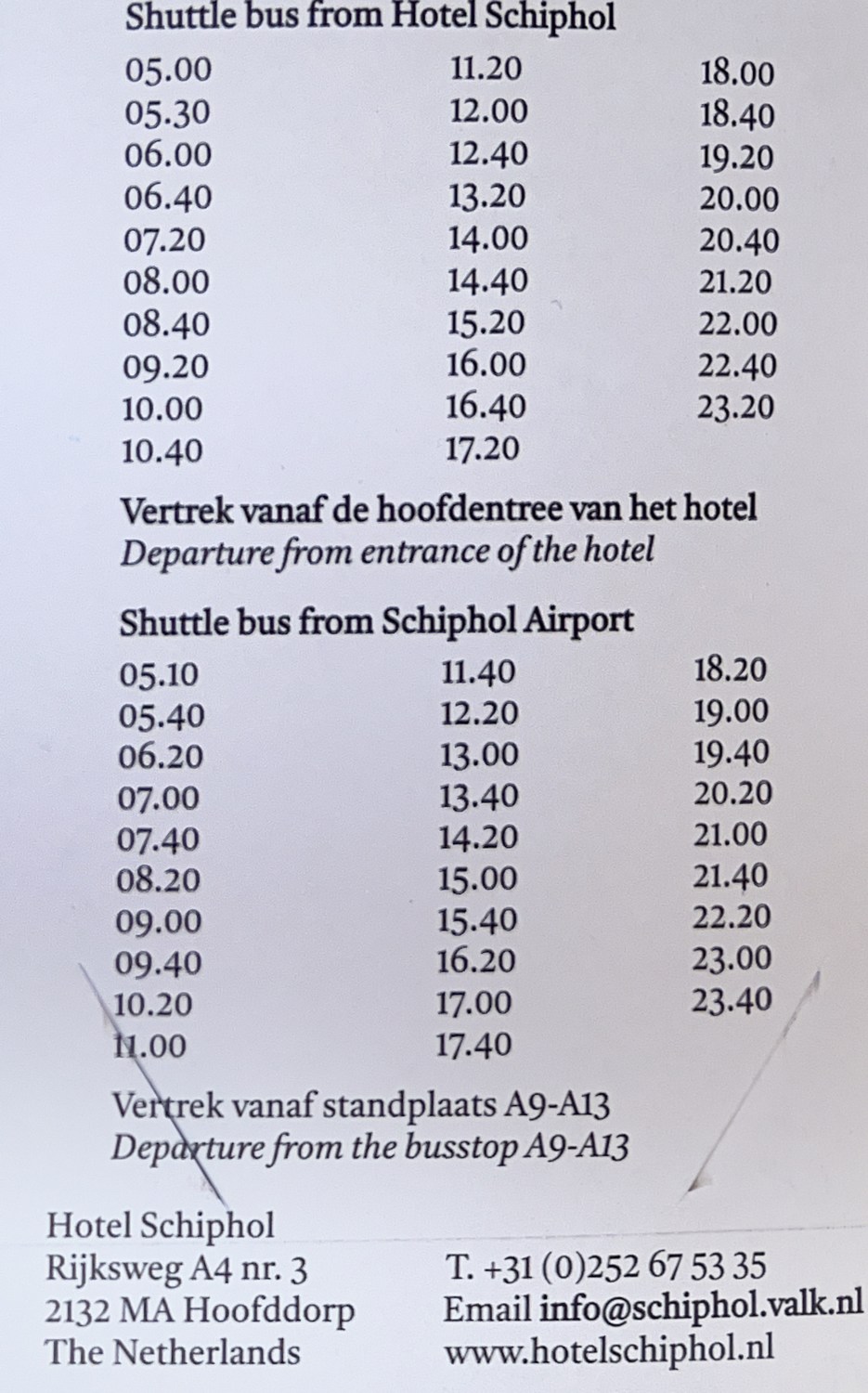 There are frequent buses between stops A9 – 13 at Schiphol Airport and the hotel. Ride takes about ten minutes. Note that the hotel has a bit of an identity crisis. The buses say ‘Van der Valk Hotel Schiphol’, whereas most hotel signage is simply ‘Hotel Schiphol’.