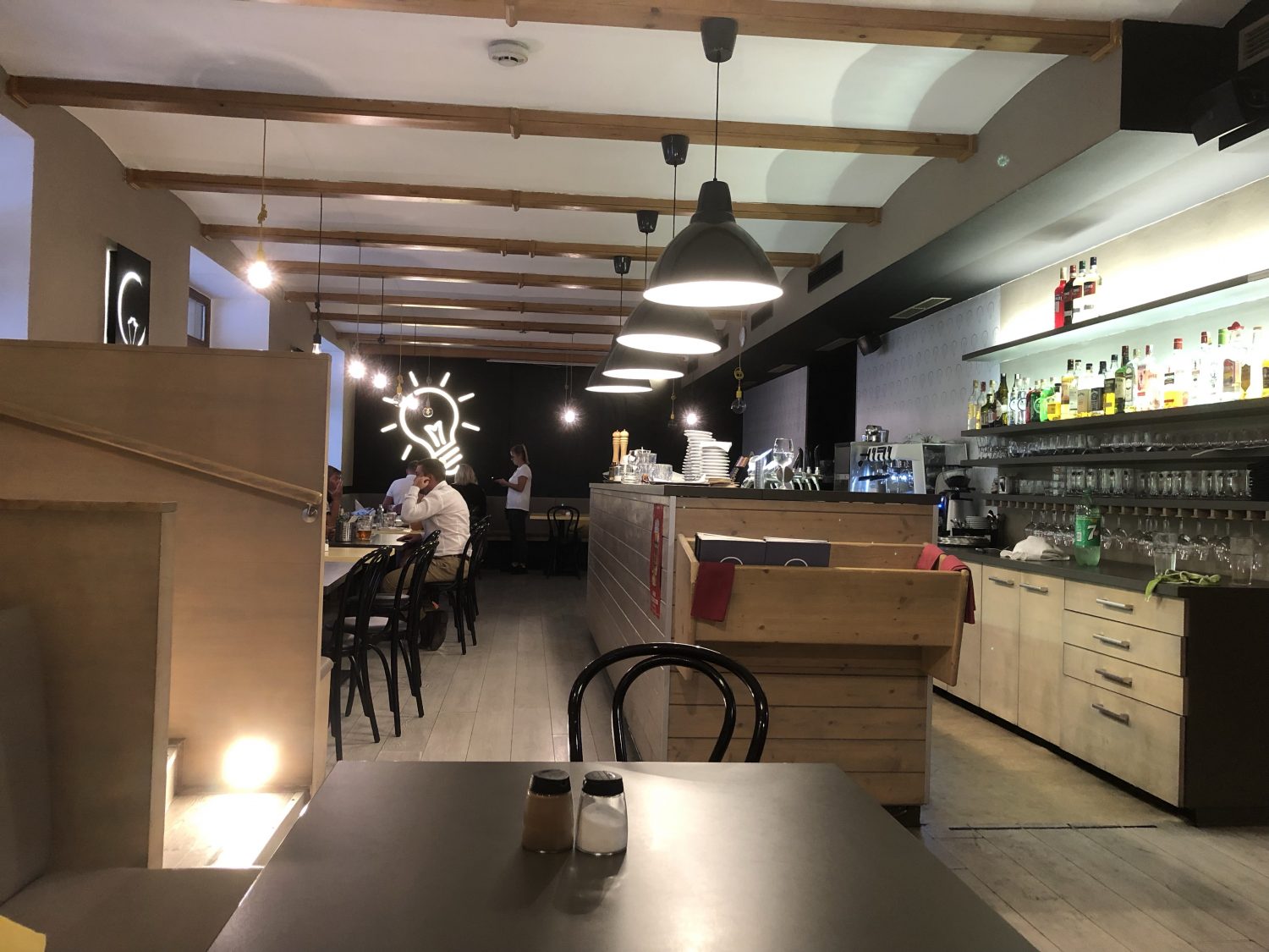 A 0.5l Pernštejn Arnoštova 10 beer is 55 Kč. A bottle of Primitivo 499 Kč.