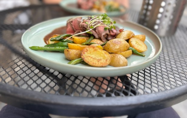 Roast beef (served cold) with demi glace sauce, bean pods, roasted grenaille potatoes with chive butter 349 Kč. A delicious summer dish.