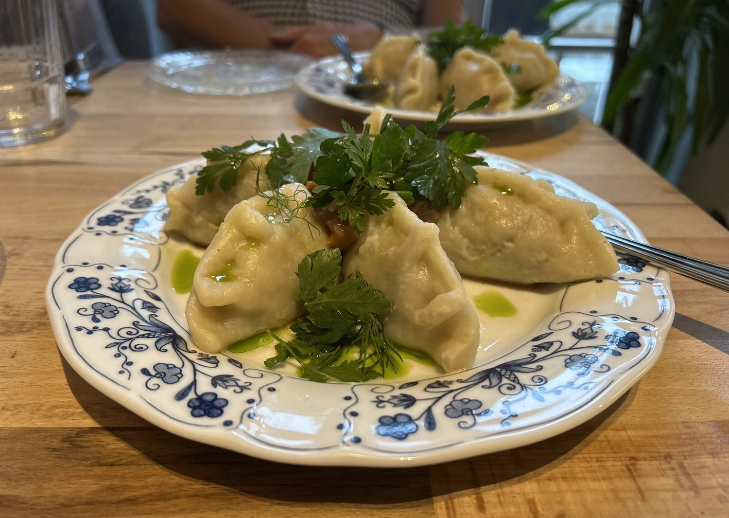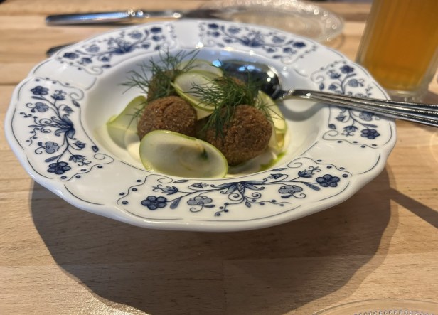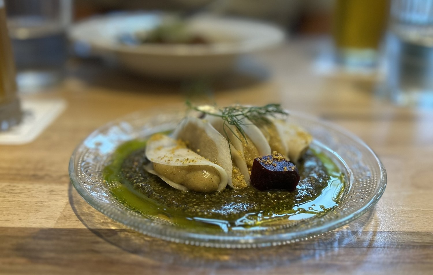 Kohlrabi dumplings stuffed with lentils and fenugreek, pickled beet, pumpkin seed pesto (26 zlotý).