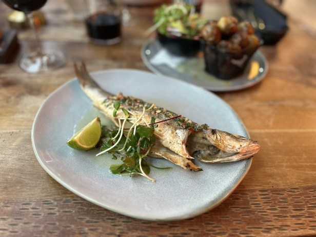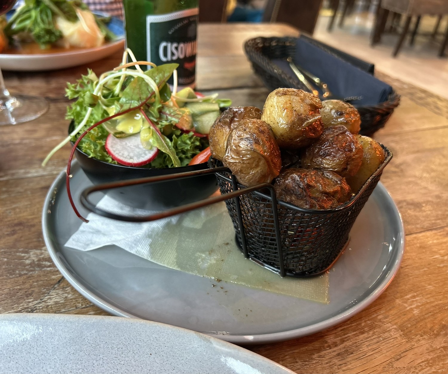 Whole roasted sea bass, served with herb and garlic roasted potatoes, and a mixed salad with vegetables and vinaigrette 76 zł. Looks a bit sad but was very good.