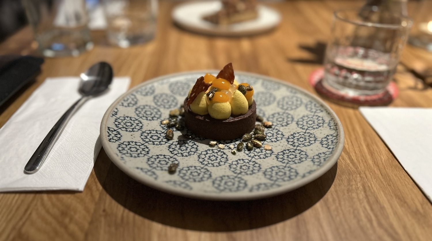 The pumpkin tartlet, gingerbread, caramel, chocolate, apples in calvados 155 Kč was delight, although the pastry crust was hard to cut without sending the entire tartlet flying across the table.