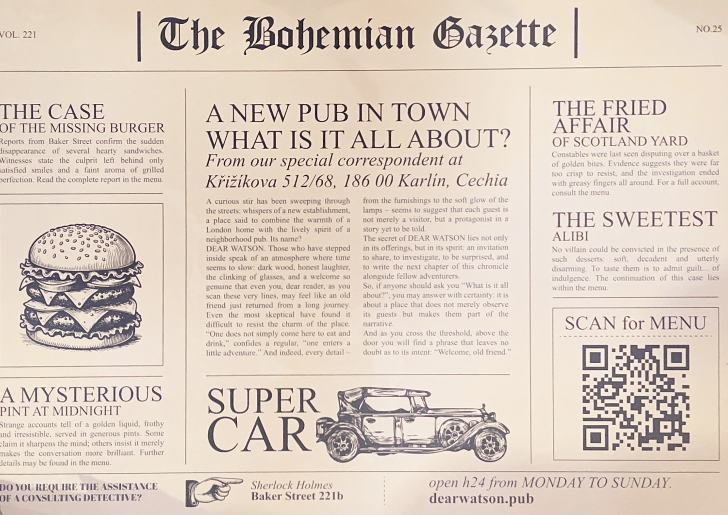 My dear Watson, you will, I trust, forgive my intrusion upon your evening, but I feel compelled to report the discovery of a most curious establishment, opened 4th of October, 2025, in the Prague district of Karlín.