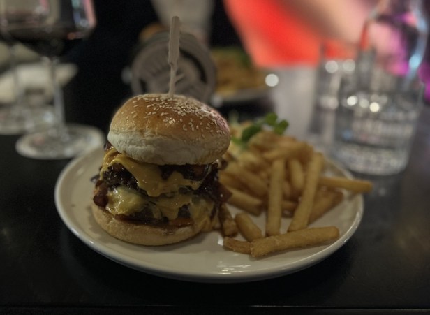 The Smash Burger (180g beef, onion jam, bacon, cheddar, sriracha mayo and crunchy fries (315 Kč) was much better than we were expecting – a really good burger.