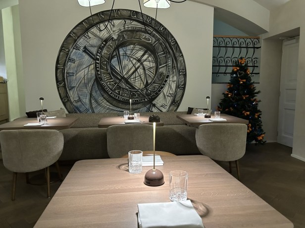 A 0.75l bottle of water 140 Kč. The tasting menu 3200 Kč per person – there is no à la carte. There are two wine-pairing options; classic 1800 Kč and concept 2700 Kč, There’s also a non-alcoholic cocktail pairing for 990 Kč.