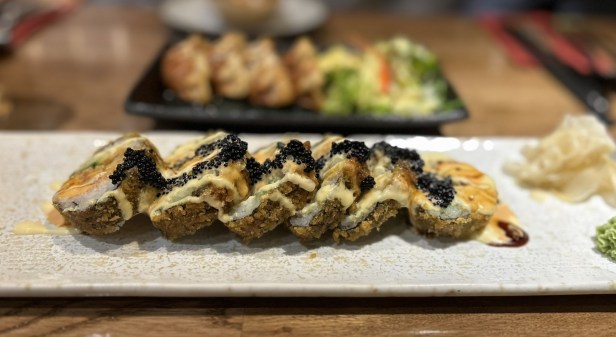 The Yuzu Crunch roll was excellent – Inside: fried shrimp, salmon, avocado, cucumber, Philadelphia cheese, Outside: Yuzu-mango sauce, Spicy-Mayo sauce, Unagi sauce, caviar. (300 Kč).