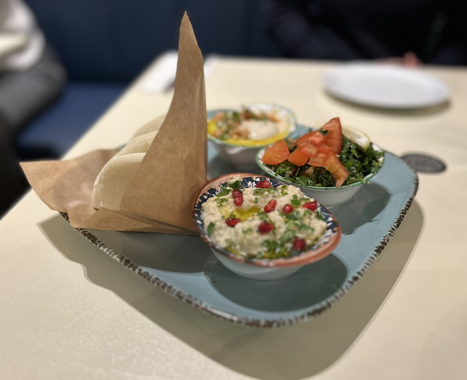 We chose three items from the mezze list: Hummus, Baba ganoush (smoked eggplant dip with pomegranate seeds and coriander) and Tabbuleh (chopped fresh parsley with bulgur, tomatoes, onions, lemon juice, salt and pepper) – comes with pita bread. 275 Kč.