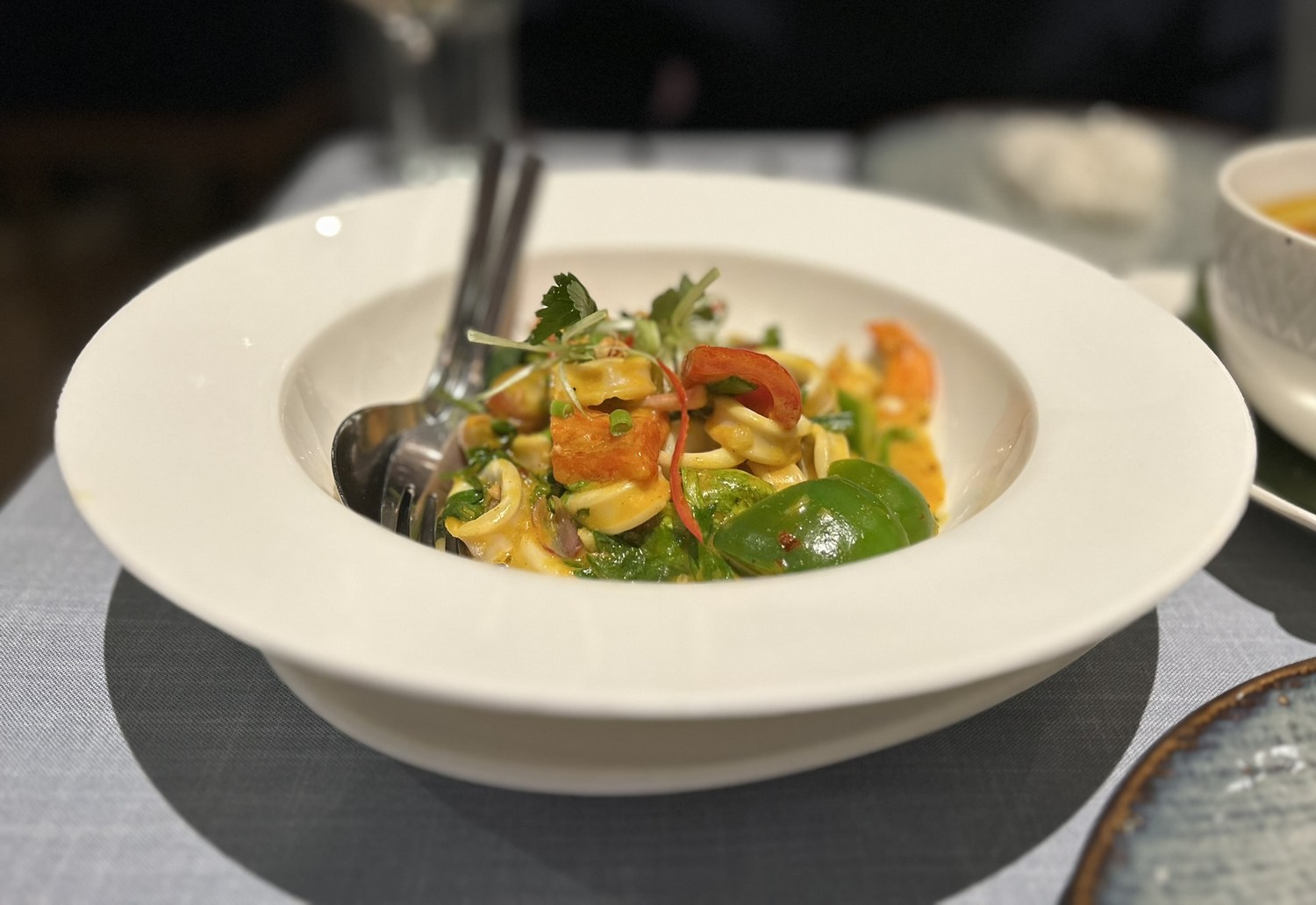 The stir-fried seafood curry – squid and prawns, green and red capsicum, shallots,coconut cream, oyster sauce, fish sauce, garlic, kinchay leaf, chili paste and tamarind juice (US$10.50) plus rice (US40.40) was excellent.