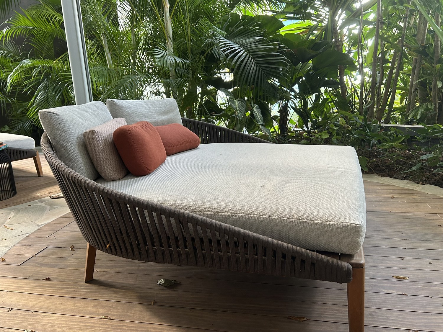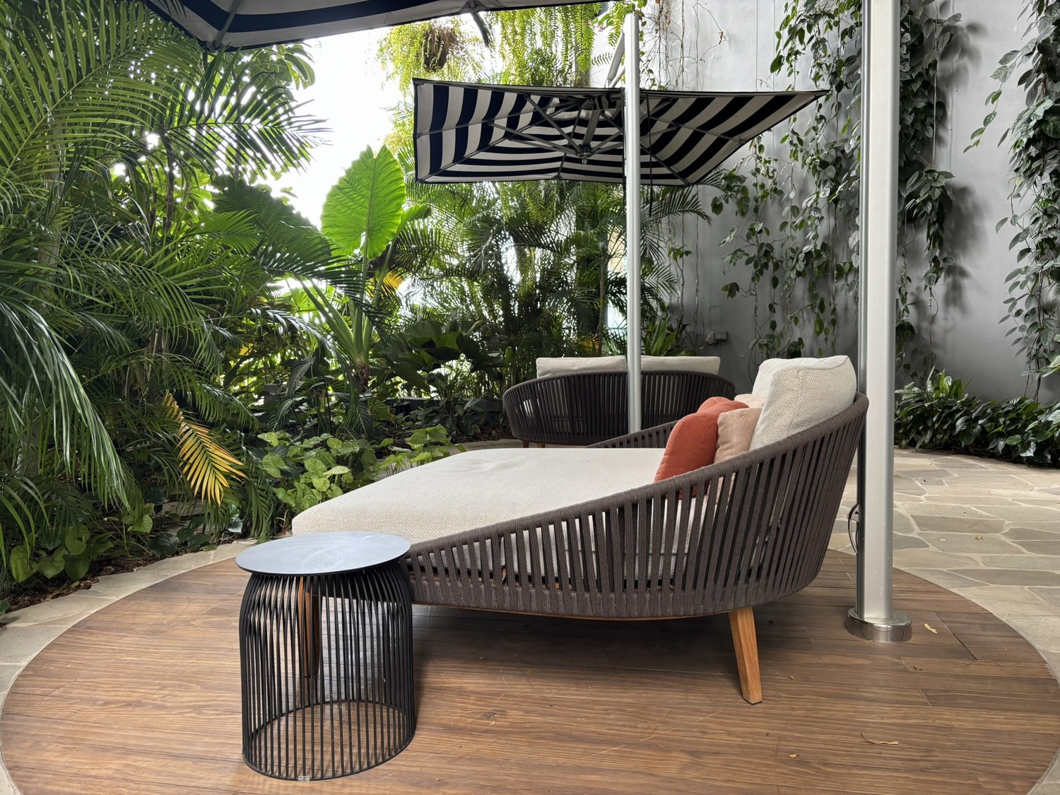The terrace, surrounded by trees, is a peaceful sanctuary with two day beds.
