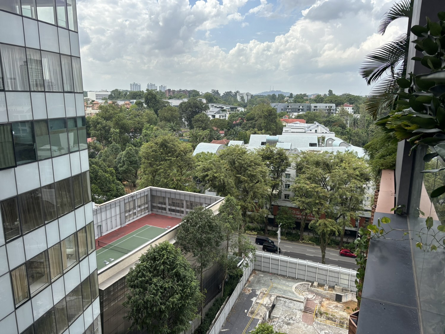 There is a small view to the surrounding buildings, one of which had a tennis court.