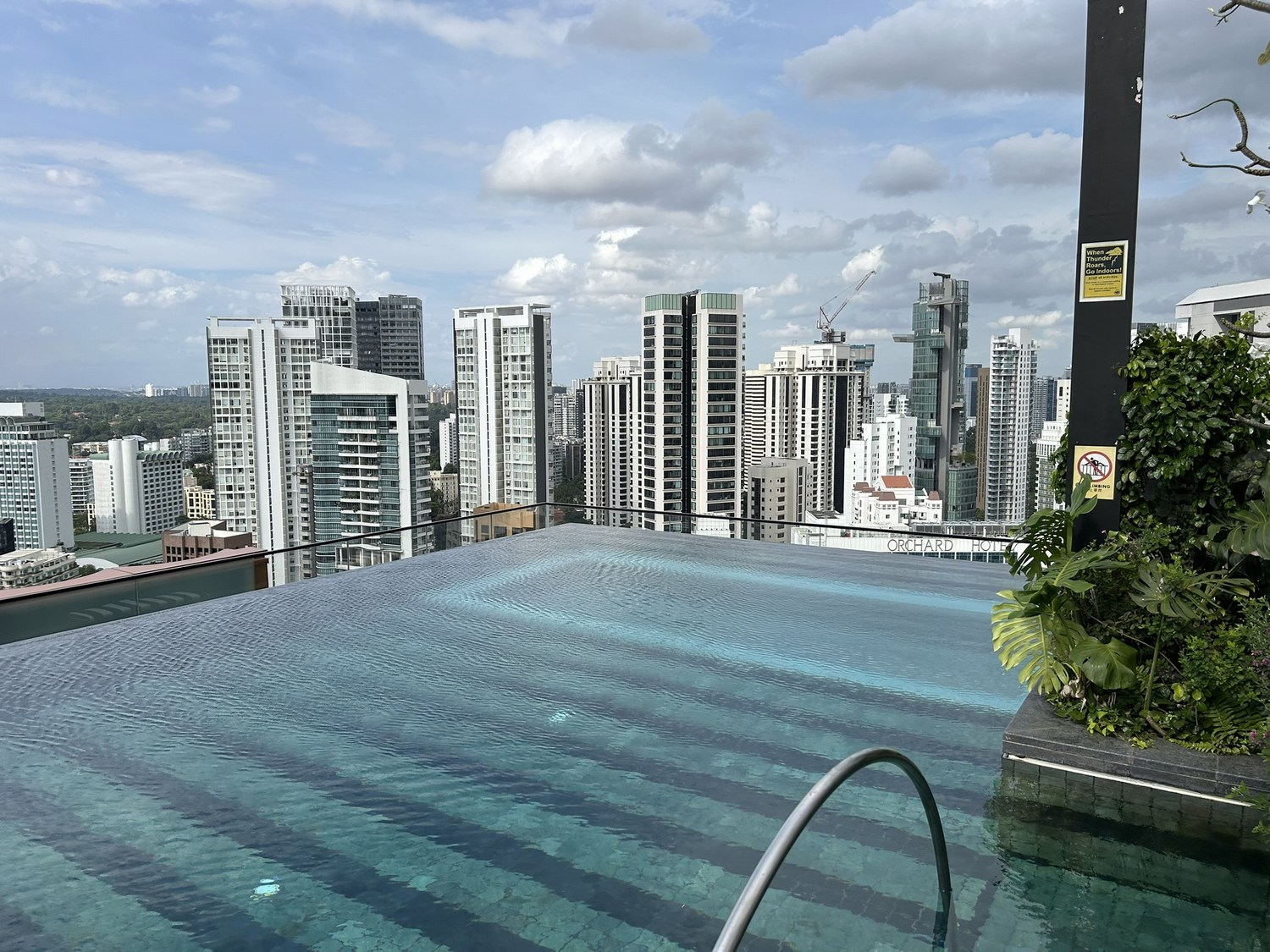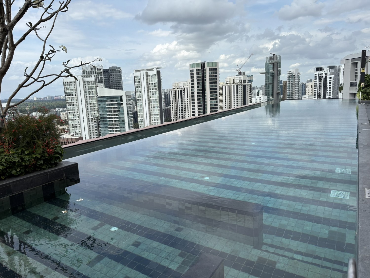 The rooftop infinity pool is spectacular. The far-end of the pool is a cantilever, with a glass floor. The water was surprisingly chilly, despite the air temperature of 31 degrees C. Pool towels and tap water were provided – Singapore has good and safe tap water.