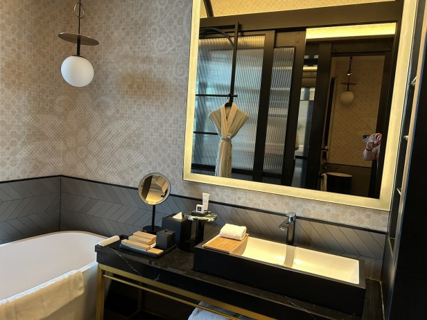 The bathroom has all the luxury amenities you’d expect from a luxury hotel.