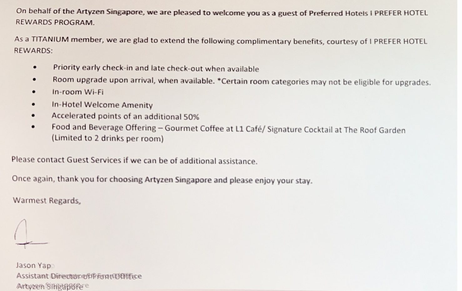 The desk agent took full payment (6 nights) plus a cheeky S$200 per night deposit for incidentals. My Preferred Hotels Titanium Status wasn’t mentioned – we weren’t looking for an upgrade as we had booked a Grand Terrace. There was no mention of the complimentary house car, nor any local map offered.