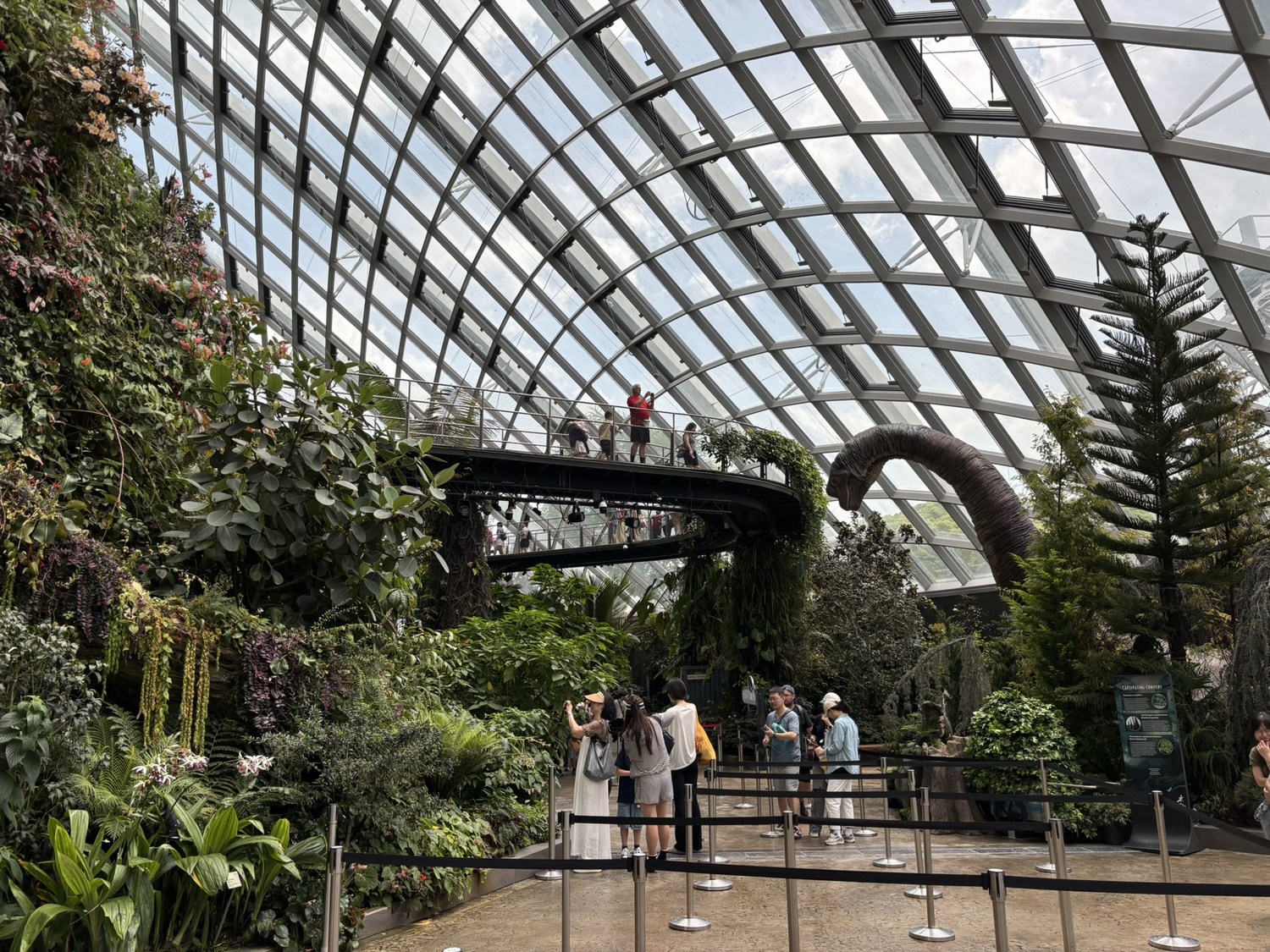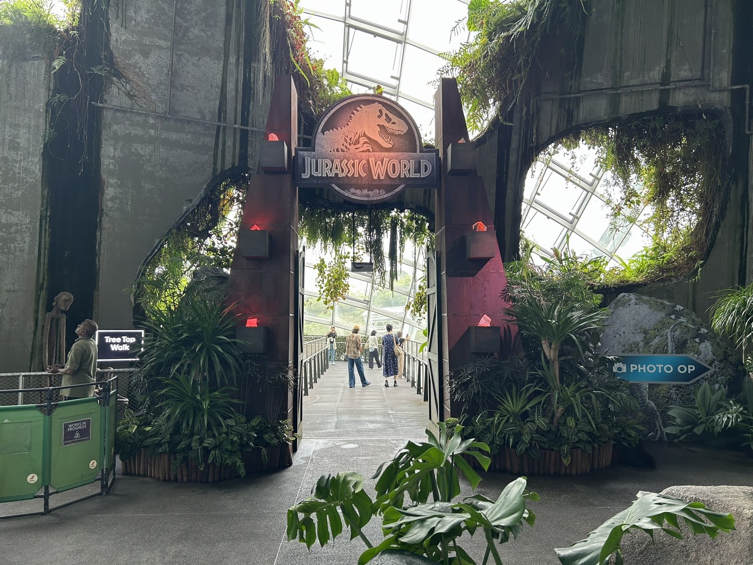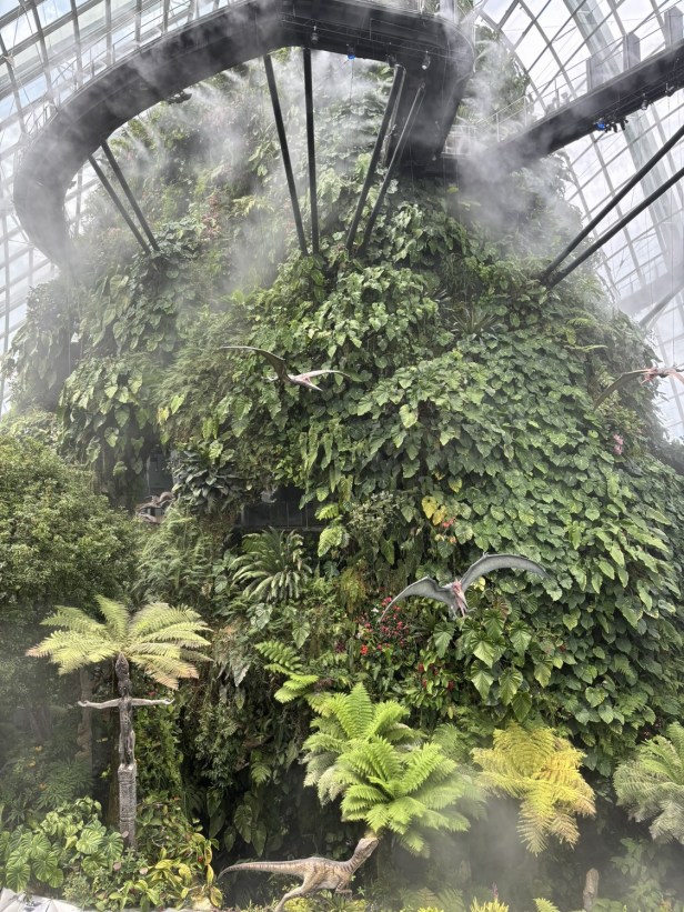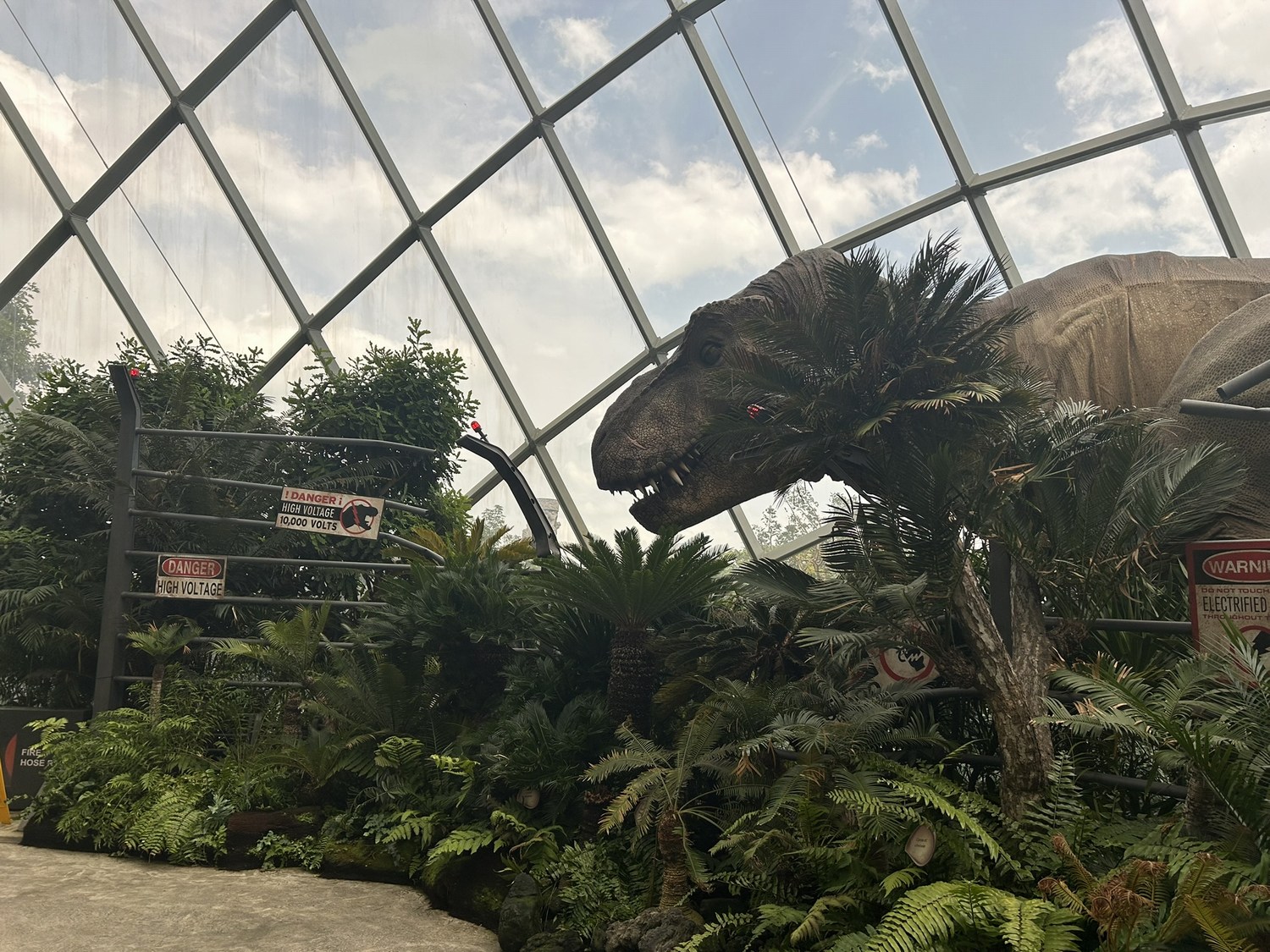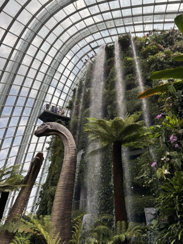 The sheer scale of the dome, the cascading waterfall, and the elevated walkways is already incredible — but with the Jurassic World installations added, the whole experience feels completely supercharged.