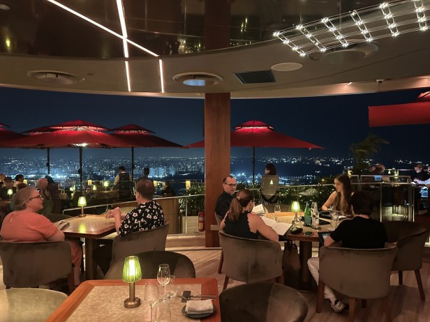 There are two lines for the elevators – those with a reservation have the shortest line. The restaurant is mostly open air, although there are some semi-indoor tables.