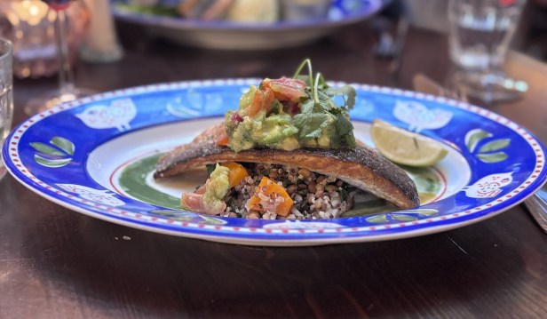 £19.50 from the regular menu: Pan-fried seabass served with ancient grains & roasted butternut squash, tomato, caper & avocado salsa, lime & coriander. Not excellent but pretty good.