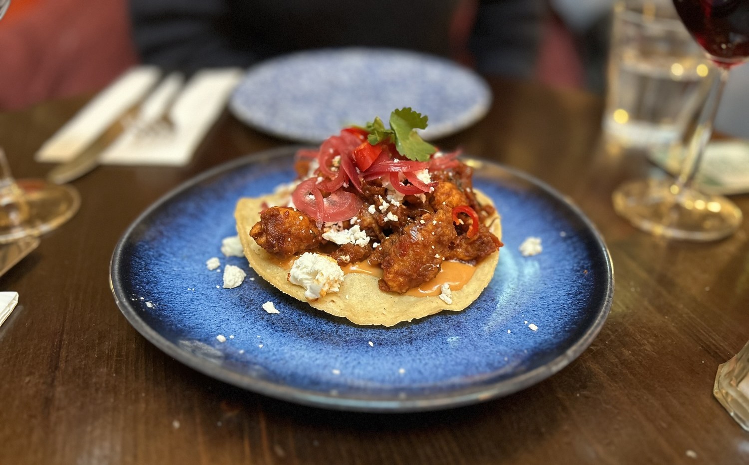 From the Heritage Menu starters: Crispy duck tossed in a smoky tomato salsa on a tostada with pickles & crumbled feta. Delicious!