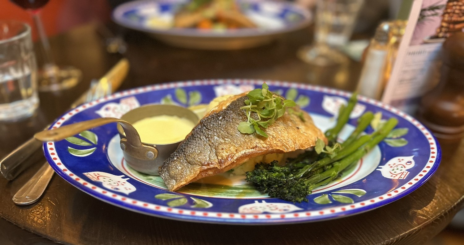 From the Heritage Menu mains: Pan-fried seabass served on chive mashed potatoes & tenderstem broccoli. Served with a lemon butter sauce. Not excellent but pretty good.